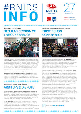 Issue 27 of the RNIDS Info corporate newsletter brings an overview of events at RNIDS and in the local and global Internet community in the last quarter of 2015. A regular session of the RNIDS Conference of Co-founders was held, as well as a public session of the Board of Governors and the first RSNOG Conference.