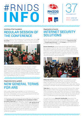 Issue 37 of the RNIDS Info corporate newsletter brings an overview of events at RNIDS and in the local and global Internet community in the fourth quarter of 2017. A regular session was held of the RNIDS Conference of Co-founders, at which new General Terms and Conditions for the Operation of Accredited RNIDS Registrars were approved.